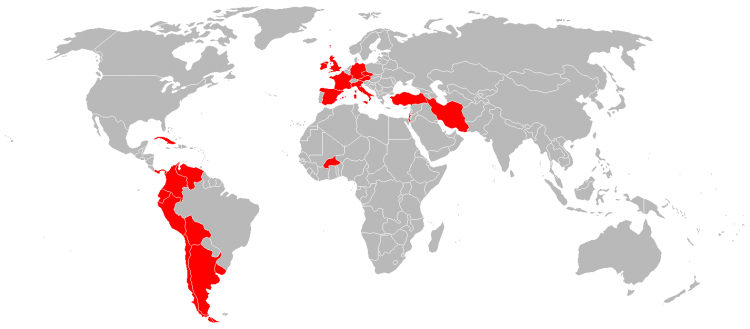 Andorra, Argentina, Austria, Bolivia, Burkina Faso, Chile, Colombia, Cuba, Czech Republic, Ecuador, France, Germany, Iran, Israel, Italy, Palestine, Peru, United Kingdom, Uruguay, Venezuela